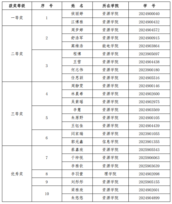 各分团委、团工委、广大学生: 长安大学第一届“地探未来”地质科技作品竞赛由共青团长安大学委员会主办,共青团长安大学地球科学与资源学院委员会承办。在广大同学的积极参与下,本次活动取得了圆满成功,现将获奖名单公示如下: 共青团长安大学委员会 共青团长安大学地球科学与资源学院委员会 2025年11月25日