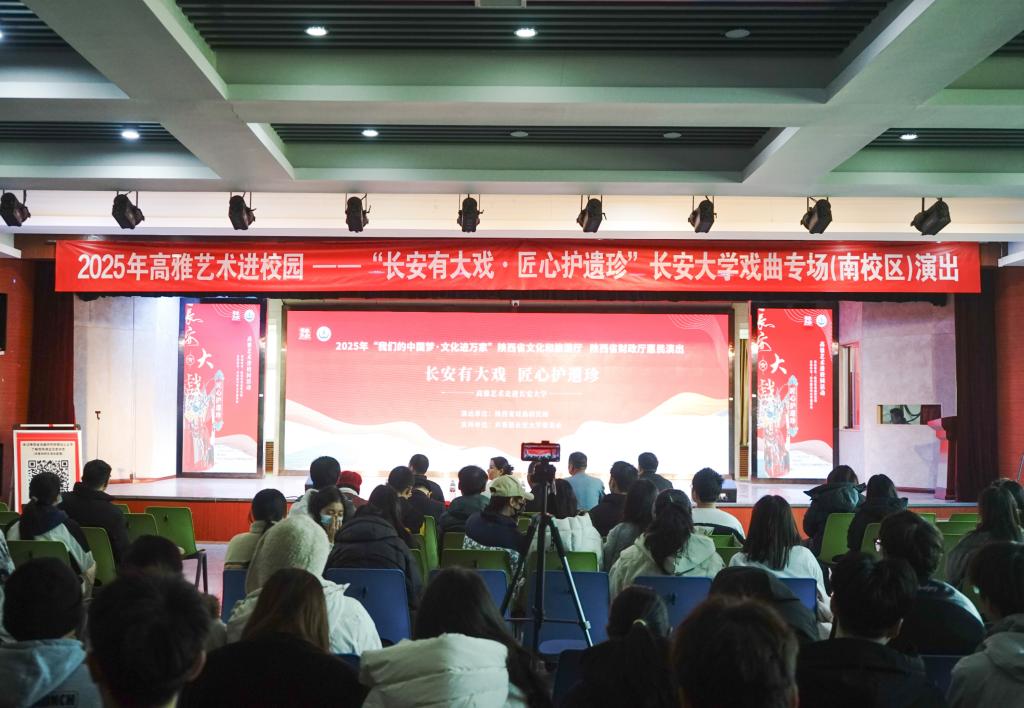 12月4日,2025年高雅艺术进校园“长安有大戏·匠心护遗珍”活动在长安大学南校区东院雁博园多功能厅举行,300余名师生一同观看演出。
