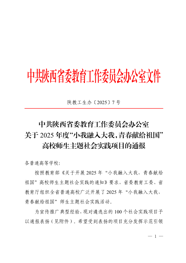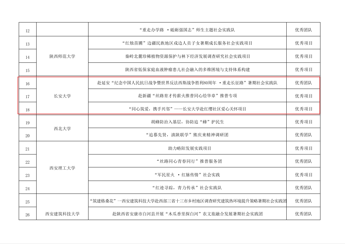 近日,2025年“小我融入大我·青春献给祖国”高校师生主题社会实践优秀项目表彰结果揭晓。长安大学赴延安“纪念中国人民抗日战争暨世界反法西斯战争胜利80周年·重走长征路”暑期社会实践队荣获“优秀团队”称号;长安大学赴新疆“丝路育才传薪火 推普同心绘华章”推普专项、“同心筑爱,携手兴邻”——长安大学赴红缨社区爱心关怀项目荣获“优秀项目”称号。