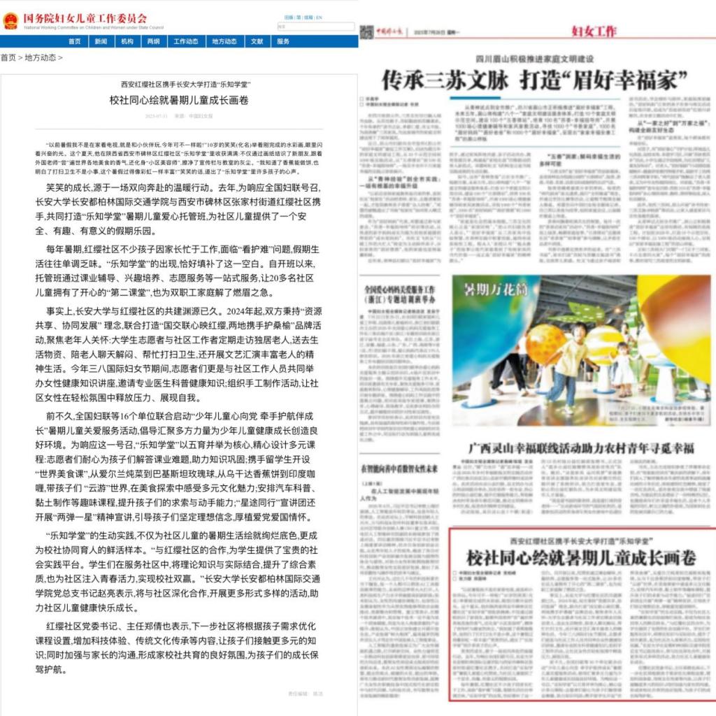 “同心筑爱,携手兴邻”——长安大学赴红缨社区爱心关怀项目。项目精准对接西安市碑林区红缨社区“一老一小一妇”的现实需求。项目与社区共建“社会实践联合教育基地”,创新“初访建档-定期回访”全周期关怀模式。志愿者们不仅为独居老人送去生活陪伴与精神慰藉,更在暑期打造“乐知学堂”爱心托管班,通过“五育并举”的多元化课程体系,解决双职工家庭子女“看护难”问题。项目融合课业辅导、安全教育、多元文化体验、劳动实践与爱国主义教育,形成了可复制、可推广的校社协同育人新范式,获《中国妇女报》等权威媒体广泛报道,成为高校服务基层治理的生动案例。