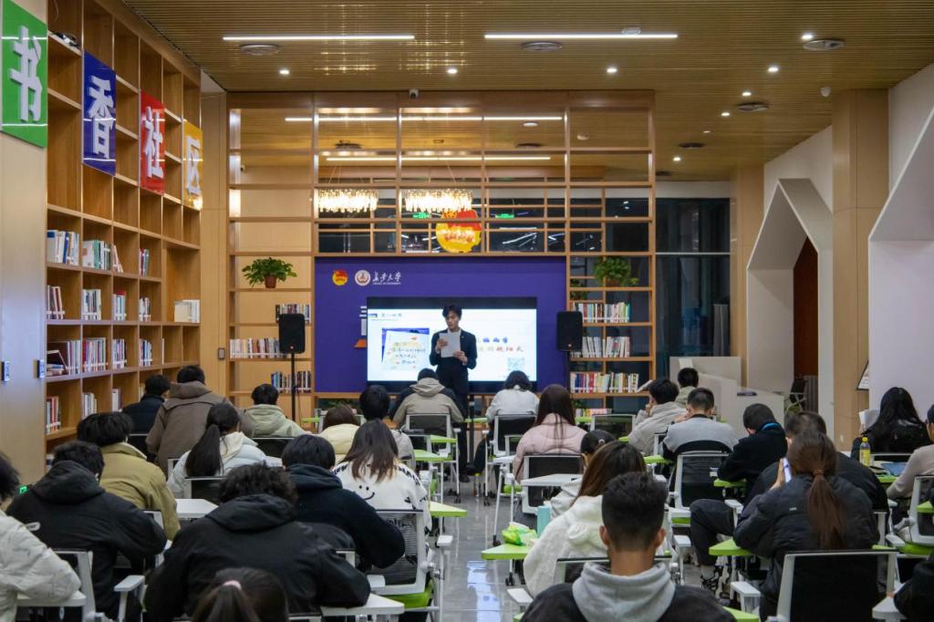 洪辰新以“道阻且长,行则将至”为题,分享了他从土地工程学院绩点第一成功转入软件工程专业的经历。前两学年绩点4.1,连续两年获得国家奖学金,他在学科竞赛、志愿服务、文体活动中均有出色表现。他强调“竞赛不止于获奖,更是能力积累的过程”,鼓励同学们“明确目标,多线程操作,不断提升自我竞争力”。