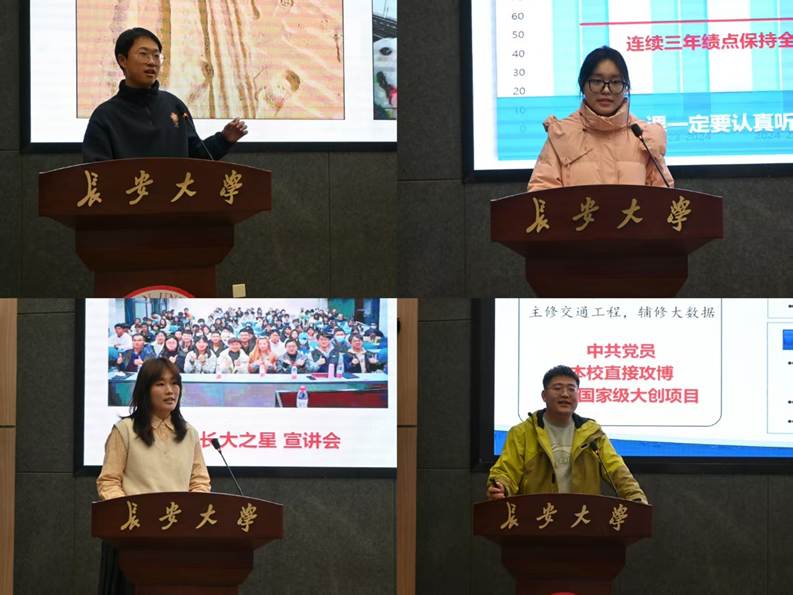 2025年12月19日晚,长安大学“创·π”沙龙(第十七期)之创新创业风云人物论坛活动在师生服务大厅二层第二报告厅举办,本次活动邀请了“长大之星”与“双创之星”雷洋寒、杜欣樾,许清芽、胡帅祥作为宣讲嘉宾,分享各自在科研、竞赛与学习方面的经历与经验。