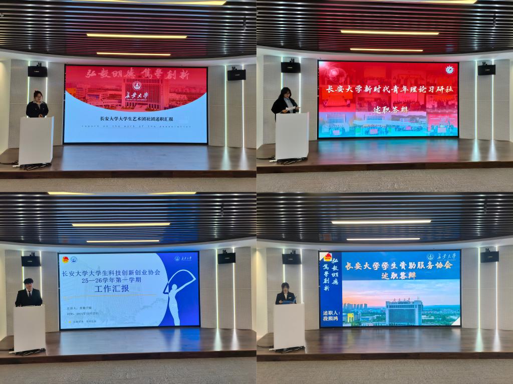 为全面总结学年社团工作成果,促进各社团之间的交流互鉴与规范发展,2025年12月27日,长安大学2025-2026学年校属社团工作汇报交流会在长安文化艺术中心二楼数字思政展示体验中心顺利召开。校团委社团文体部副主任韩烁及青年素质拓展中心主席团成员担任会议评审,校属78个社团负责人代表参与了本次述职汇报。