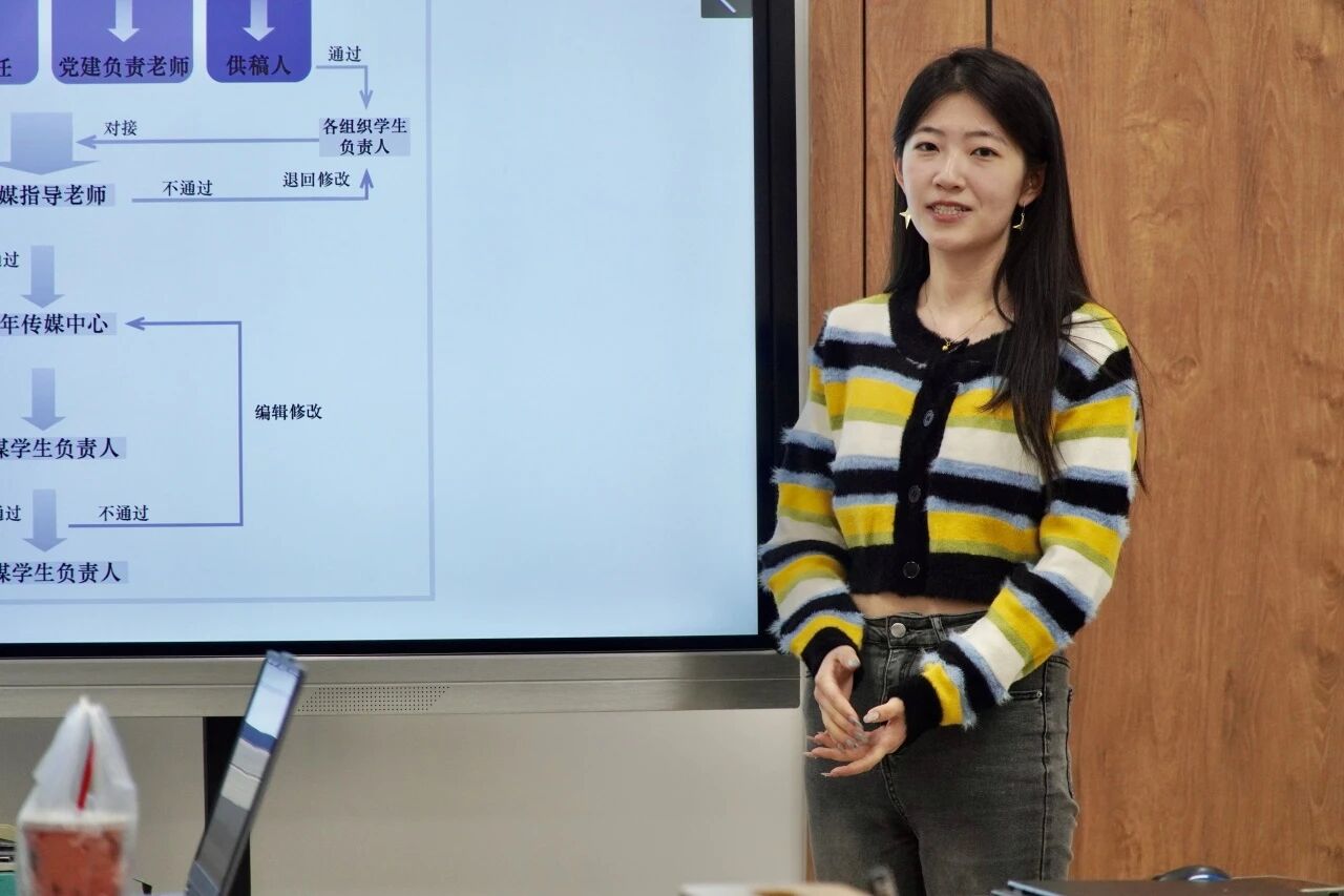 随后,青年传媒中心主任王曼婷统一介绍青媒日常工作,向新同学清晰展示常规任务,为大家快速适应团队节奏提供指引。