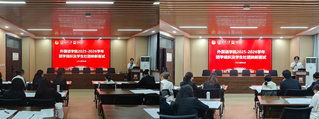 9月19日,长安大学外国语学院2025-2026届本科生团学组织及学生社团纳新面试在223报告厅顺利举行。本次答辩共有53名新生参与,报名人数创历史新高。面试由学生工作办公室副主任王子章、院团委书记杨文佳、主席团成员及学生会各部门负责人代表担任评委,由学生会主席奉晶萍主持。