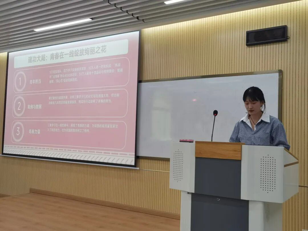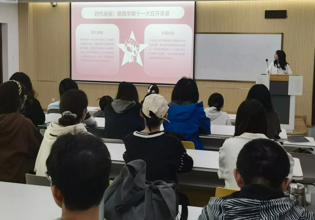 主席团成员董浩然以延安精神为切入点阐释精神根脉。她结合陕学联百年重要事件回顾历史传承,详解“三级联动学习”“台账式落实”等贯彻要点,最后传达“强国有我”的青春动员令,强化成员使命认知。