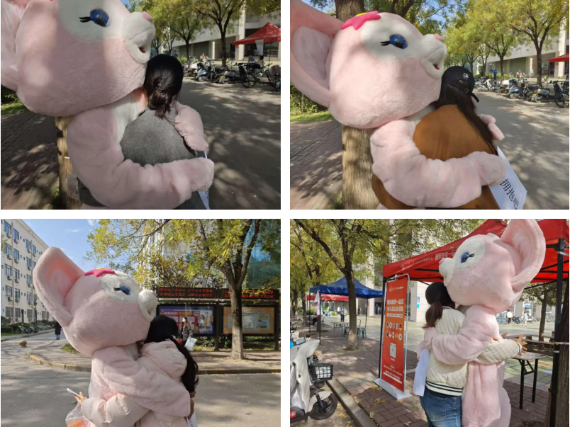 随后,活动进入核心的“自由拥抱”环节。由志愿者们扮演的可爱玩偶“抱抱熊”成为全场焦点,他们手持写有“Free Hugs”、“你今天很棒!”等温暖标语牌,主动向路过的同学们张开双臂。起初有些羞涩的同学们,在轻松愉快的氛围感染下,纷纷停下脚步,与“抱抱熊”热情相拥,现场充满了欢声笑语。
