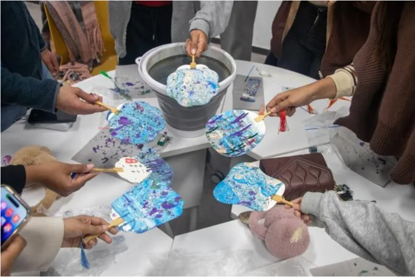 本次活动分为Handicraft production和Free Talk两个环节,在动手实践与思想交流中搭建文化与语言的桥梁。在手工制作环节,现场设置了手工漆扇、吉祥中国结、精美剪纸三大国风手作体验区。同学们在轻松愉悦的氛围中,亲手感受水与颜料的交融、线条与绳索的编织、纸张与剪刀的刻画。无论是初次尝试手工艺的新手,还是热爱传统技艺的爱好者,都沉浸在创作的乐趣中,在指尖流转间体会东方美学的独特韵味。