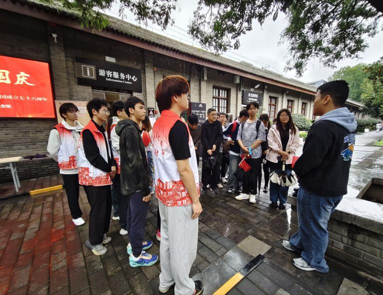 在此次团日活动中,部分团员化身“红色志愿者”,在游客服务中心及馆内核心区域开展服务。他们主动引导游客寻找与历史展品的最佳合影角度,帮助游客留存红色记忆;在国旗领取处,他们耐心指导游客扫码操作,确保每位参观者都能领到一面国旗,让红色氛围浸润全场;同时,志愿者们还细致整理馆内宣传资料,方便游客取阅,主动调整休息区座椅间距,营造整洁舒适的等候环境;针对馆内互动活动,他们有序为参与游客分发纪念徽章、历史知识书签等小奖品,鼓励大家深入体验红色文化。“从‘看历史’到‘传历史’,志愿工作让我真切感受到传递红色精神的价值。”参与服务的公路学院2023级许轶楠同学面对陕西广播电视台记者采访时说道。