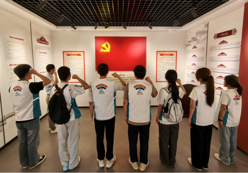 参观结束后,实践队员们面向庄严的党旗重温入党誓词。