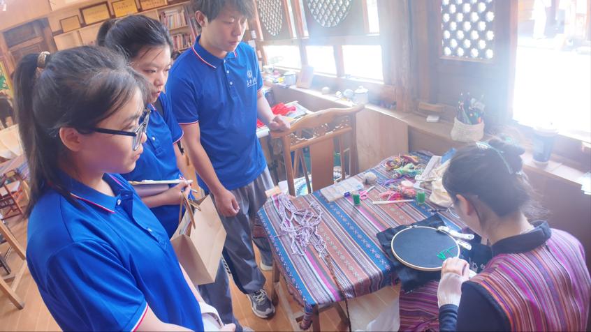 下午,实践队来到白沙锦绣美术院。院内陈列的锦绣作品色彩艳丽、图案精美,涵盖了纳西族传统服饰纹样、自然景观等元素。在老师的指导下,队员们旁观学习这些复杂而精美的技艺,切身体会到滇绣的独特魅力。白沙锦绣艺术院相关老师讲到,近年来,为了传承和发展滇绣技艺,当地采取了一系列措施,如组织专业刺绣大师培训农村妇女,让更多人参与到滇绣的传承与创作中来,不仅带动了当地经济发展,也让这一古老技艺焕发出新的生机。实践队员们与老师们深入交流,了解滇绣从图案设计到成品完成的整个流程,以及在市场推广和文化传播方面所做的努力。