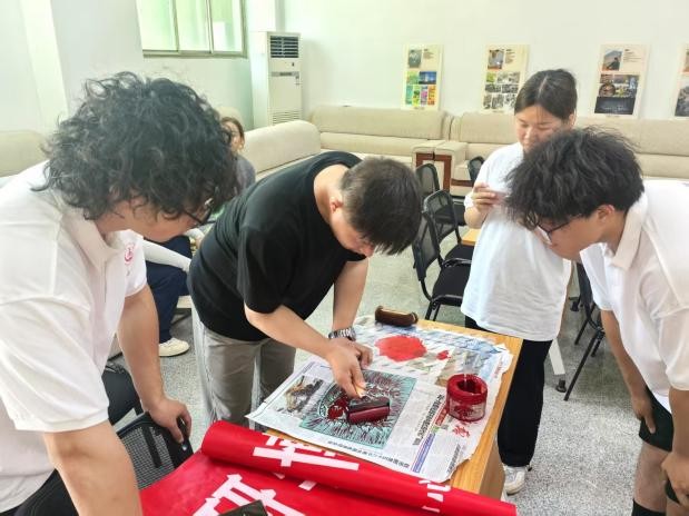 在木刻版画制作体验环节,民间艺人何伟伟现场指导团队成员们实践创作。成员们通过精准调控油墨浓稠度、运用墨滚均匀施墨于雕版、定位覆盖宣纸、以棕刷多次拓压等工序,亲手完成多幅版画作品。这一沉浸式体验不仅使成员们切身感受到非遗技艺“毫厘之差,意境迥异”的精妙准则,更在刀笔纵横间深化了对传统手工艺的敬畏与认同。
