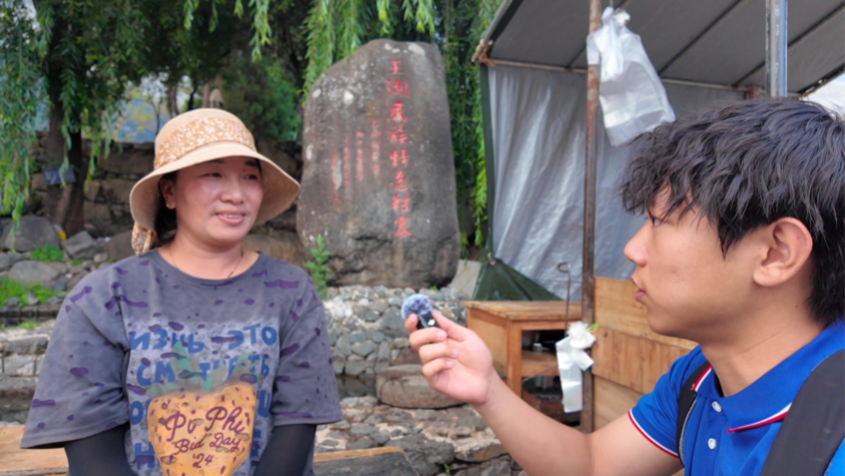 下午,实践队抵达玉湖村。在当地向导的带领下,队员们深入村内生态治理区域,实地了解玉湖村如何通过实施水源保护、植被修复等一系列行之有效的措施,持续改善生态环境,将“绿水青山就是金山银山”的科学理念转化为生动实践。队员们走进非遗工坊,近距离观赏纳西族传统刺绣、木雕等非遗技艺的展示。在这里,古老的非遗技术不仅得以传承延续,更通过文创产品开发、旅游体验等创新形式,为乡村经济注入活力。