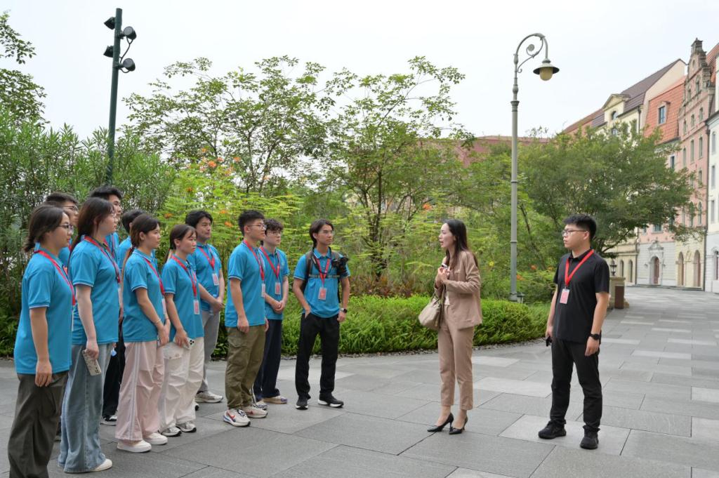 随后,师生前往华为东莞松山湖基地参观。在溪村园区,队员们沉浸在欧洲小镇的科技人文融合氛围中,搭乘华为“智慧小火车”穿梭维罗纳拱桥、海德堡城堡等欧式建筑群,体验华为“自然与科技共生”的园区设计理念;在三丫坡园区,队员们走进三丫坡图书馆,图书馆巨型圆形穹顶由对称的16组巨型铜铸罗马柱构成,形成16个拱形扇区,360度的环绕书架,里面的每一本书都蕴藏着岁月的沉淀,展现出华为对技术深耕与终身学习的重视。