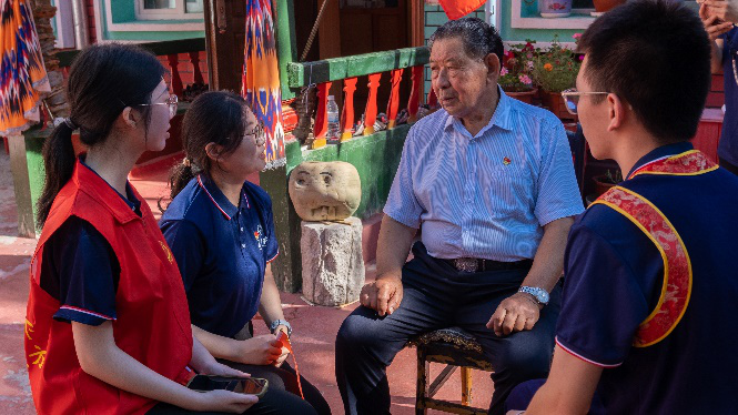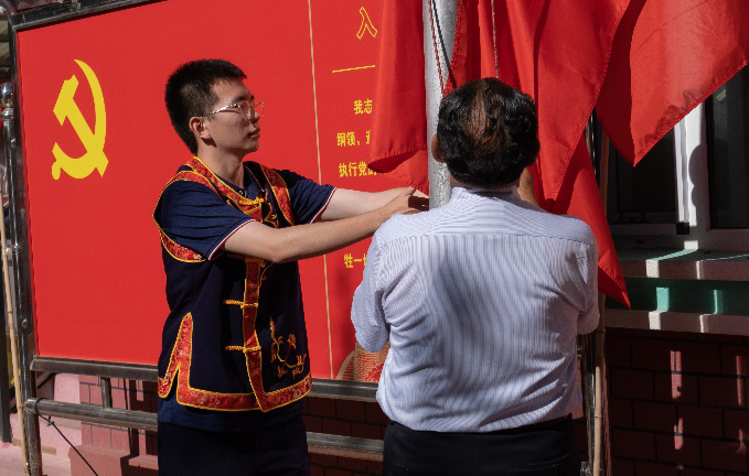 清晨的哈尔墩社区,阳光洒在沙勒克江·依明家的庭院。上午10时,伴随着《义勇军进行曲》雄壮的旋律,五星红旗在老人亲手搭建的升旗台上冉冉升起。在国旗下,沙勒克江老人进行爱国主义教育和民族团结宣讲教育,向实践队员讲述了他十六年如一日升国旗的故事,鼓励学生不忘初心、报效祖国,铸牢中华民族共同体意识,为祖国富强和民族团结贡献青春之力。