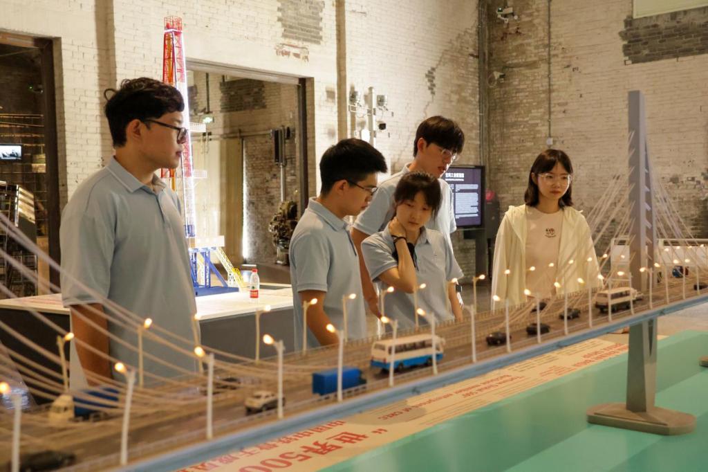实践队成员在展馆内的桥梁结构沙盘前展开讨论