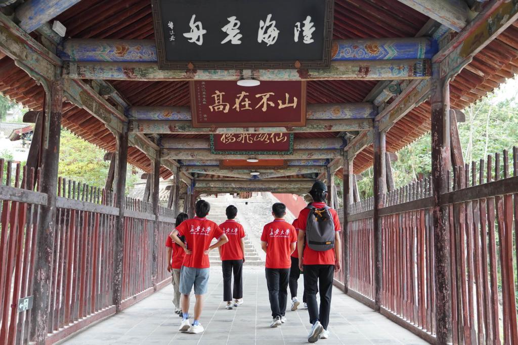 玉泉观始建于唐代,宋末遭毁,元代初期重修,历经元、明、清三代的扩建重修,形成了如今拥有89座建筑的大型道教宫观。实践队成员们沿着蜿蜒的山路拾级而上,参观三清殿、玉皇殿、文昌阁等主要建筑,了解了道教文化的内涵和发展历程。道观内陈列的书法家赵孟頫碑文作品,引发实践队员驻足欣赏学习,感受观内文化魅力。