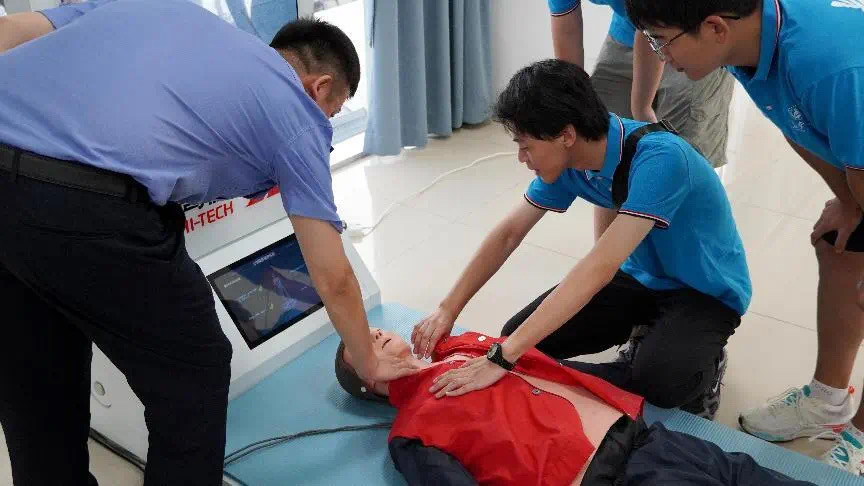 在夯实安全理论基础后,任主任为队员们进行了心肺复苏术和海姆立克急救法的现场演示与详细指导。他系统讲解了急救的“黄金时间”概念、操作原理、关键步骤及注意事项,着重强调了在突发情况下保持冷静、科学施救的重要性。在任主任的指导下,实践队员们分组利用专业人体模型进行了模拟训练。通过亲身参与急救演练,实践队员们深刻体会到,这些看似简单的急救技能,实则是守护旅客生命安全的“硬核”本领,是交通运输服务者必须具备的职业素养。