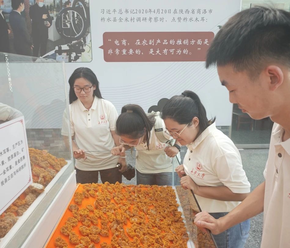 随后,实践团队来到了基地旁的木耳博物馆参观,系统了解了木耳的品种分类、种植技术的演变、产业历史发展等内容。墙上的图文展板详细追溯了柞水木耳的种植历史,从古代的传统栽培方式到现代的科技化种植,生动地展现着当地木耳产业的发展变迁。展柜里还陈列着不同品种的木耳标本,既有常见的黑木耳,也有状若花瓣的“金耳”等珍稀品种,形态各异,让人目不暇接。