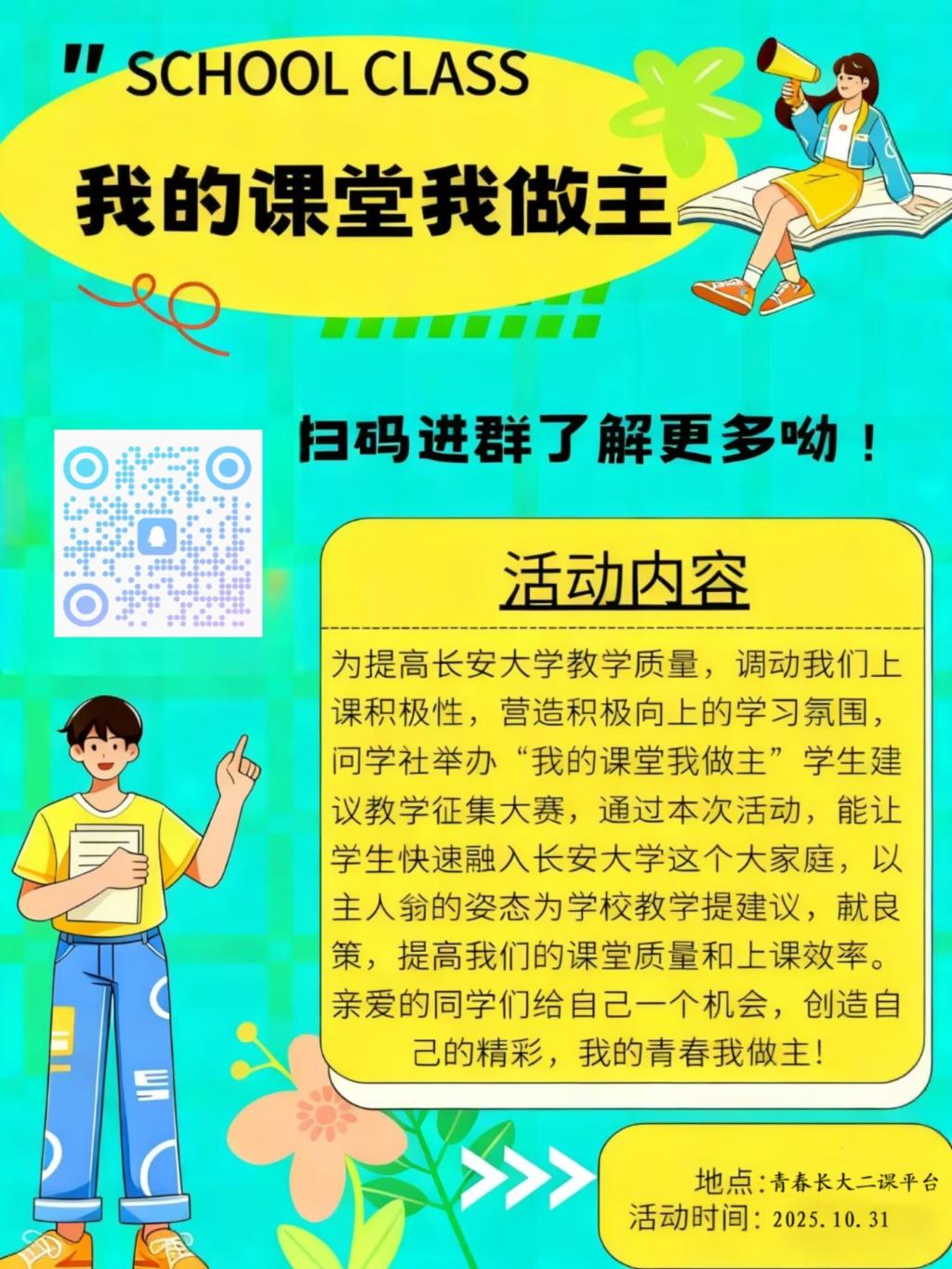 2025年10月24日至10月31日,“耕心讲堂 谏语生花”学生教学建议征集活动于线上顺利举办。此次活动由共青团长安大学委员会主办。长安大学青年素质拓展中心与长安大学问学社承办。栾碧雅老师担任指导教师。