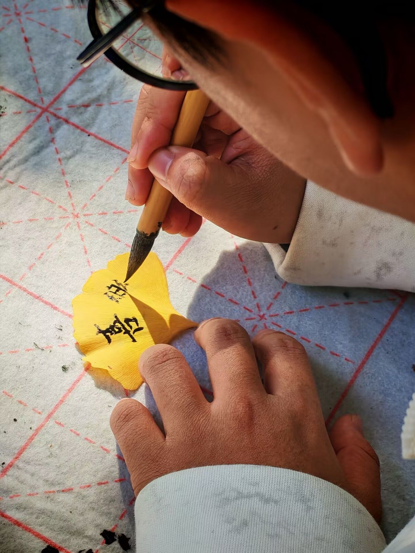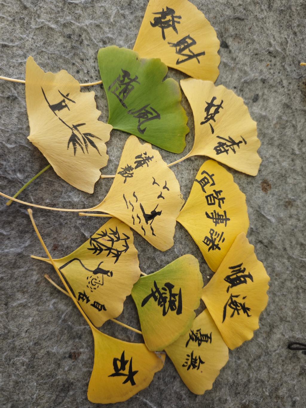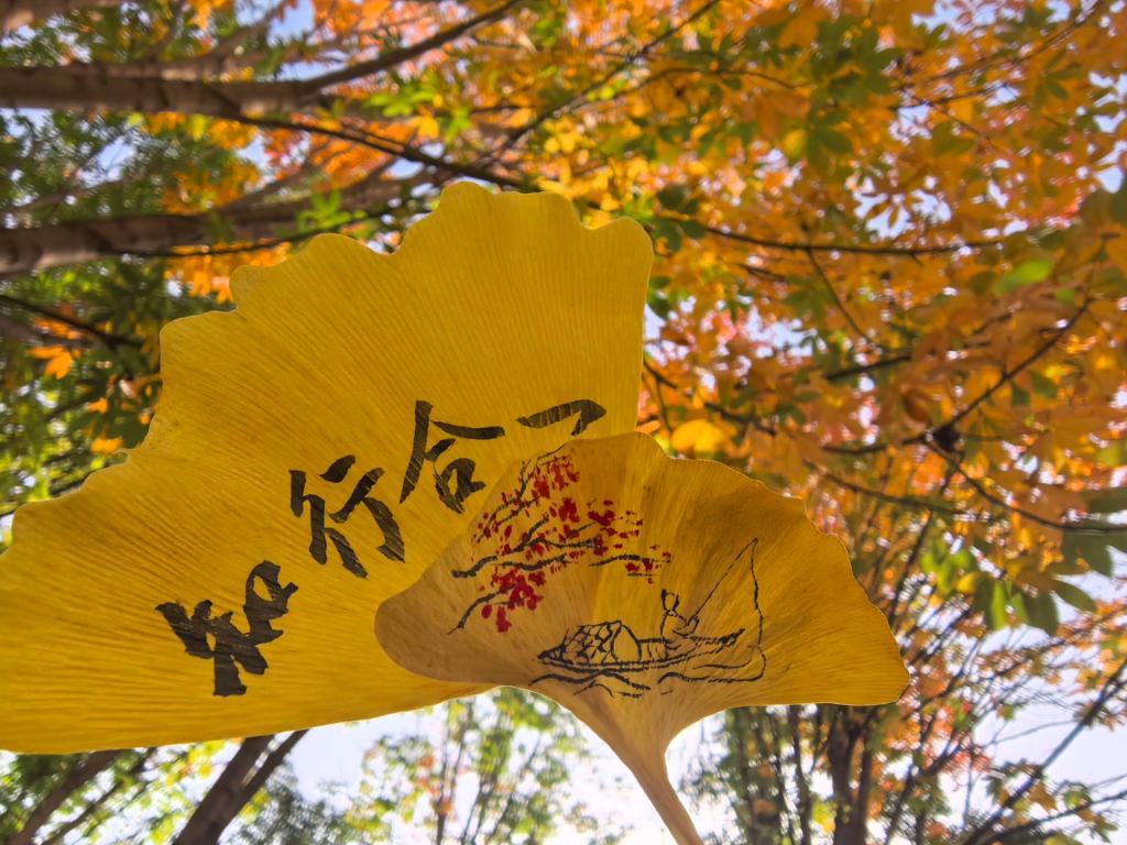 活动开始,同学们手持毛笔与颜料,在满地的金黄中精心挑选形态各异的银杏、梧桐等落叶。活动现场气氛专注而热烈。参与者俯身案前凝神创作,有人挥毫书写经典诗词,有人点染绘制写意小品。片片落叶在墨色渲染下焕发新生,遒劲笔锋与细腻叶脉相映成趣,清新画作与秋日光影交织成章。活动持续三个小时,共创作完成百余幅落叶书画作品,吸引了大量师生驻足观赏,不少观众表示这种将自然之美与人文艺术相结合的形式极具创意,让人深刻感受到"一叶知秋"的文化意境。