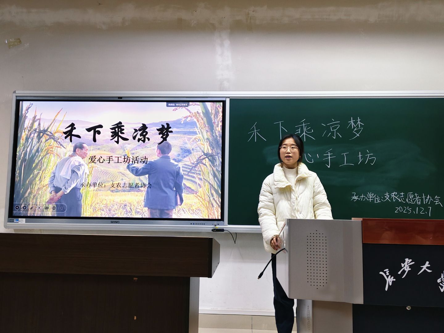 2025年12月7日,长安大学支农志愿者协会主办的“禾下乘凉梦”爱心手工坊活动在渭水校区明远教学楼1105教室开展。本次活动由共青团长安大学委员会主办,长安大学青年素质拓展中心、长安大学支农志愿者协会承办。韩春萍老师担任指导老师。