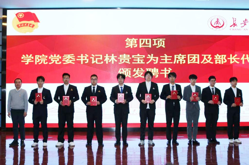 林贵宝为新一届学生组织主席团及部门负责人代表颁发聘书。