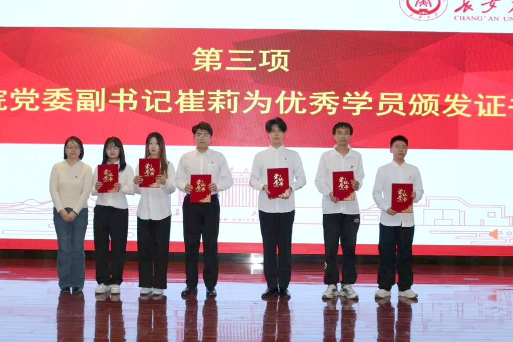 郑文捷宣读《关于汽车学院学生组织暨院属社团2025-2026学年学生干部聘任的通知》与《关于表彰长安大学汽车学院第十七期青马学校学生骨干培训班优秀学员的决定》。