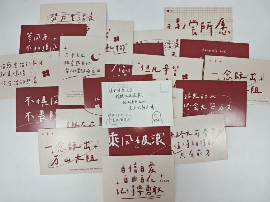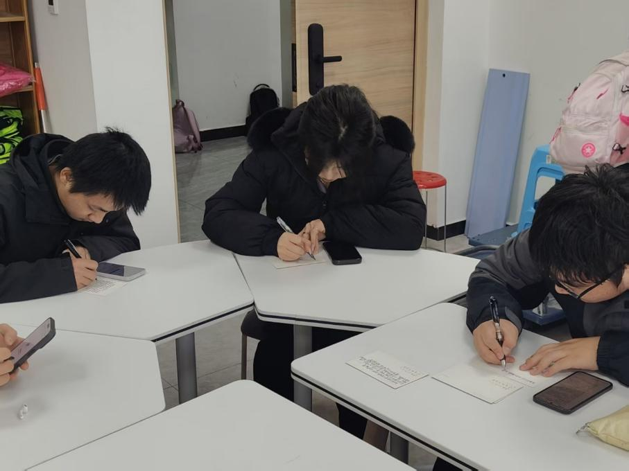 当日中午,学院团委老师与同学们一起为考研学子手写祝福贺卡。师生们围坐一堂,认真思索,落笔挥毫,字里行间流淌着对学长学姐们真挚的鼓励与祝愿。一张张贺卡在手中传递,一句句祝福在纸上凝结,凝聚成来自师生共同的温暖力量。窗外寒风凛冽,室内情意融融,这些简单而诚挚的话语,承载着深厚的温情与期许,也为正在备考的学子们注入了前行的信心与支持。