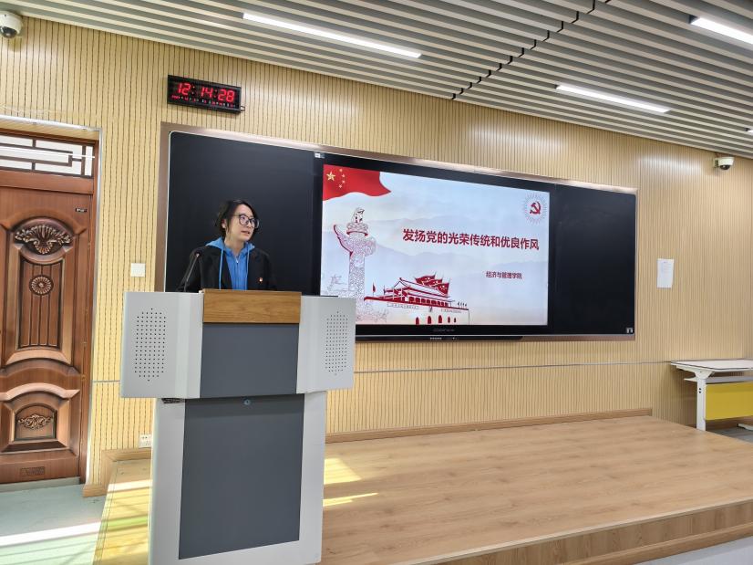 党支部书记董萍讲授《发扬党的光荣传统和优良作风》主题党课。她从党的光荣传统和优良作风的丰富内涵切入,系统阐释了新时代背景下发扬这些优良作风的重要意义,引导全体党员将红色精神内化于心、外化于行,以优良作风助力学业进步与支部建设。