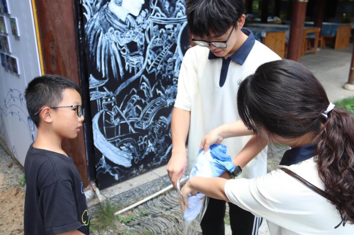 在扎染非遗传承人的巧手示范下,队员们与研学孩童结对协作:折叠白布、缠绕棉线、浸入染缸。当蓝白相间的蝴蝶纹样在T恤上绽放,孩子们兴奋地高举作品。“这抹穿越千年的靛蓝,是中华文明跃动的脉搏。”扎染之美,不仅是技艺的传承,更是蓝白相间的文明密码。