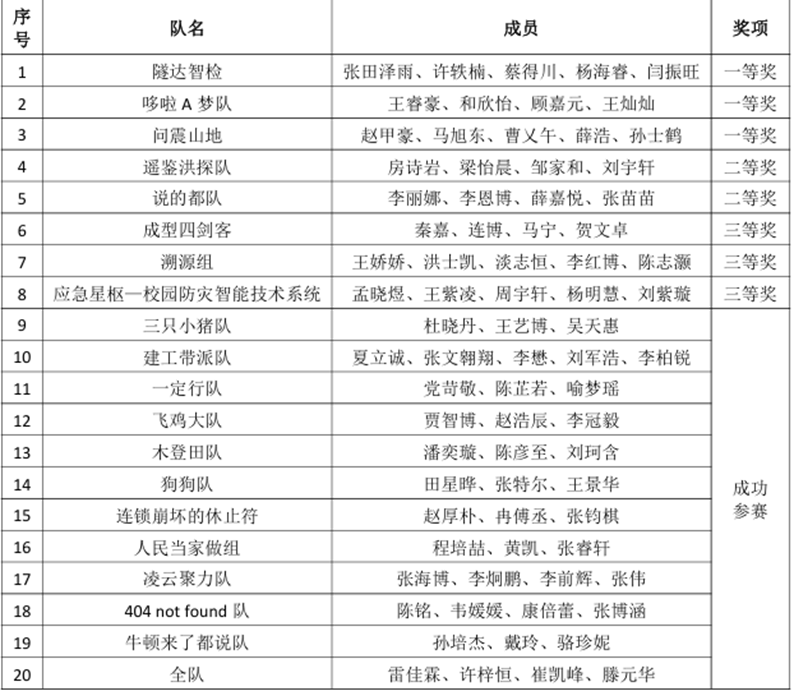 本届比赛聚焦理论知识向实操能力的转化,参赛队伍需要运用自己的专业知识,激发创新潜能,设计出独具特色的防灾减灾方案,同时完成并提交报名表和技术方案设计书。其中,团队需要在技术方案设计书中明确项目摘要、技术方案、可行性分析并说明目标预期。最终,从创新性、可行性、现实意义等方面对参赛作品进行综合评分。评审结束后,地测科协对评审结果进行汇总,共评出一、二、三等奖共八支队伍,获奖名单如下: