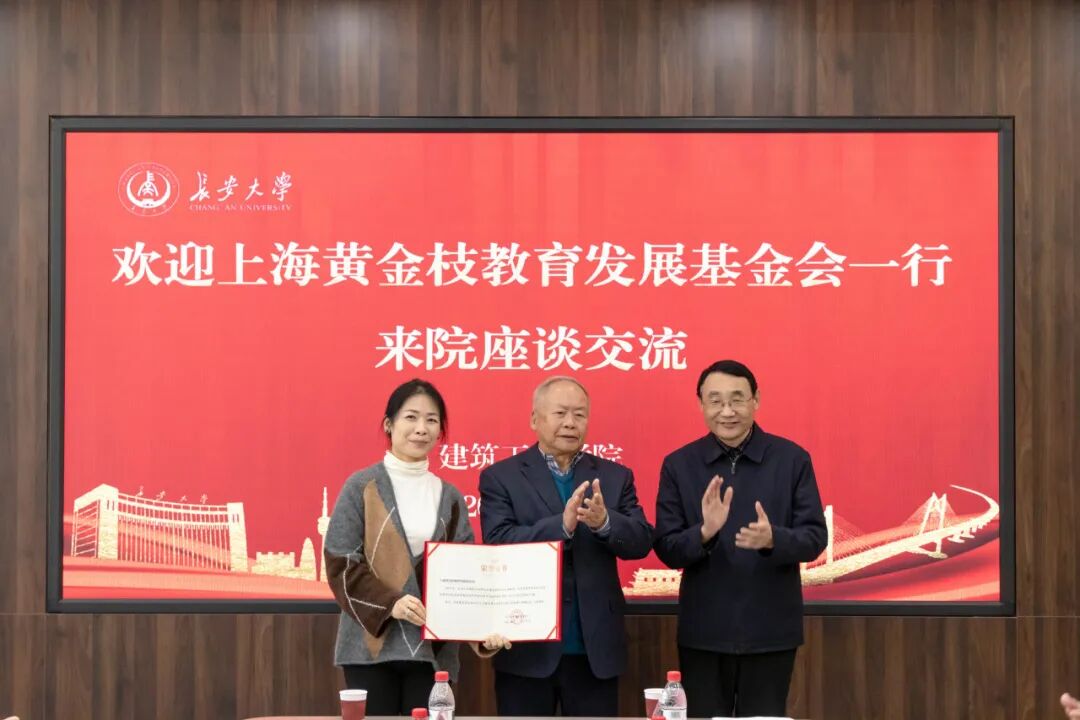 11月21日下午,上海黄金枝教育发展基金会来建工学院座谈交流,上海黄金枝教育发展基金会名誉理事长黄金枝、理事长黄奕瑾、副理事长刘永新、副理事长印晓晴、秘书长陈倩茹、捐赠人代表冯晓慧,校党委副书记、纪委书记陶继东,长安大学原副校长、学科带头人赵均海,社会合作处副处长郑睿、学院党政领导等参加座谈。座谈会由建工学院党委书记吴涛主持。