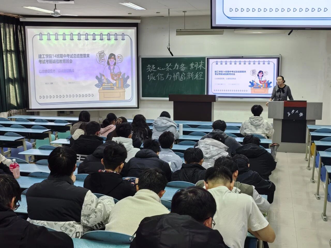 班长冯宇帆作《以诚信为帆,向期末启航》动员,引导同学化压力为动力。团支书于佳琪整合课程资料与学习平台,形成班级备考资源库并提供阶段复习建议,夯实支持网络。屈锦旭则结合学习经验,从时间规划、难点攻克、记忆与应试策略等多方面分享实用备考技巧,为同学们优化复习方案提供参考。