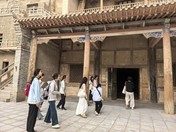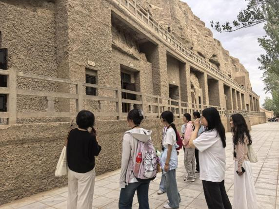 (图为长安大学学子在讲解员带领下参观莫高窟)