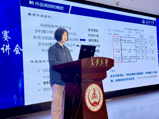水环学院往届参赛代表席之涵、理学院往届参赛代表张晓蕾进行了比赛经验分享。席之涵围绕作品类别的确定、团队的组建与构成、商业计划书的撰写、PPT的制作与答辩四个方面,分别强调选择、志同道合、逻辑清晰、自信的重要性;张晓蕾则主要从加入课题组、如何推进项目取得成果两方面分享经验,指出要多联系导师、学长,多与老师、团队成员沟通。