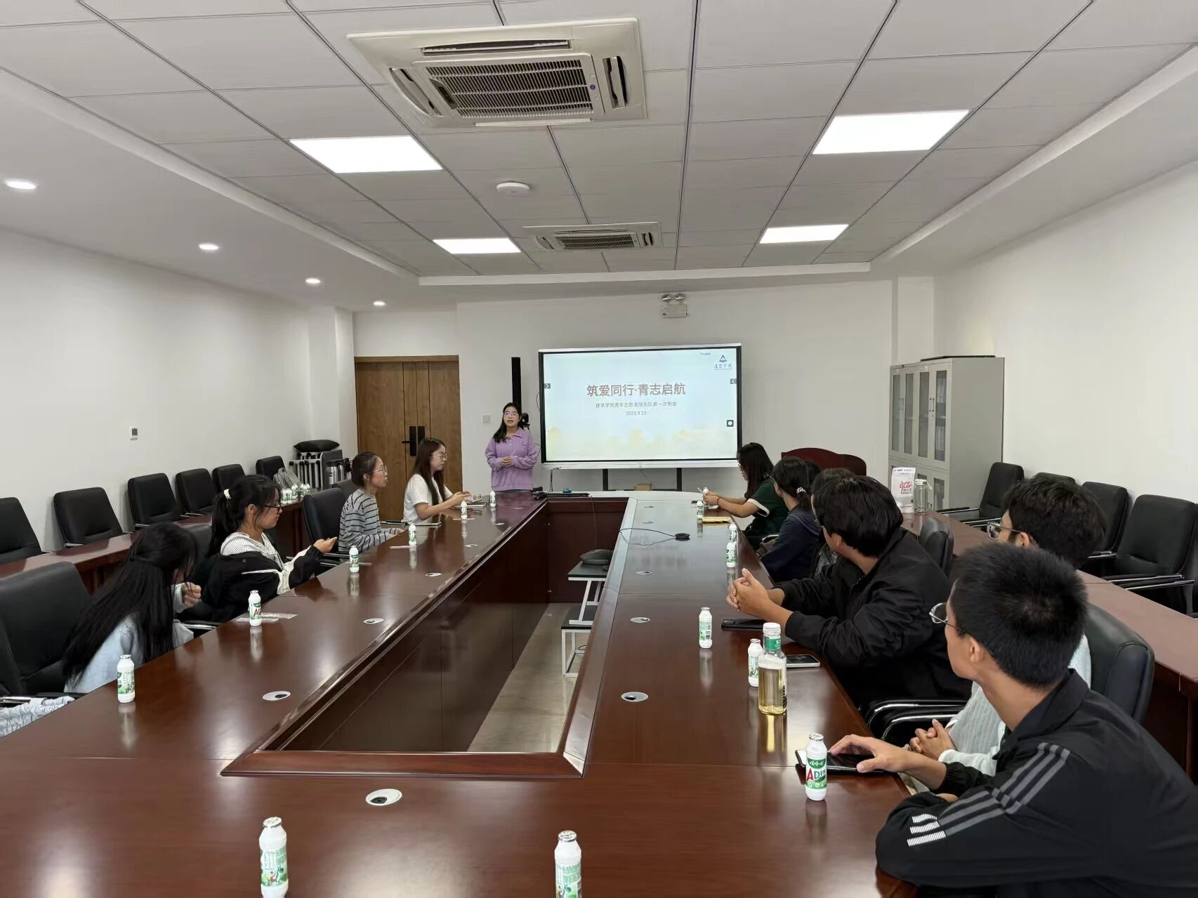 筑爱同行,青志启航。为使新成员更好熟悉组织职能,促进成员间的交流合作,2025年9月25日中午,建筑学院青年志愿者服务队(以下简称青志队)在朝晖园学生社区中心二楼会议室召开了2025-2026学年青志队第一次例会。本次会议由青志队主席罗海丹主持,指导老师王雨琪及青志队全体成员参加。