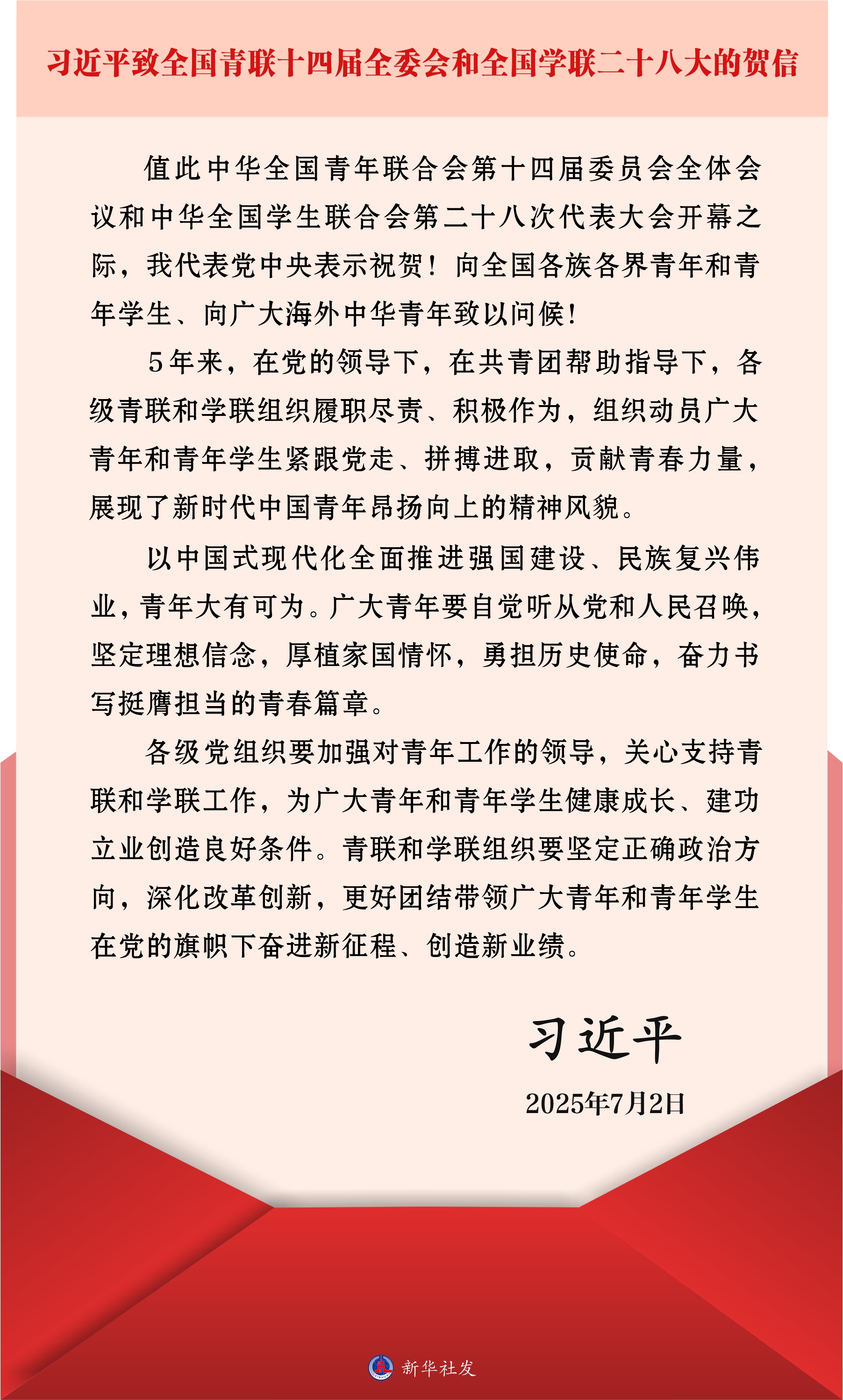 新华社北京7月2日电 中华全国青年联合会第十四届委员会全体会议、中华全国学生联合会第二十八次代表大会2日上午在京开幕。中共中央总书记、国家主席、中央军委主席习近平发来贺信,代表党中央表示祝贺,向全国各族各界青年和青年学生、向广大海外中华 青年致以问候。