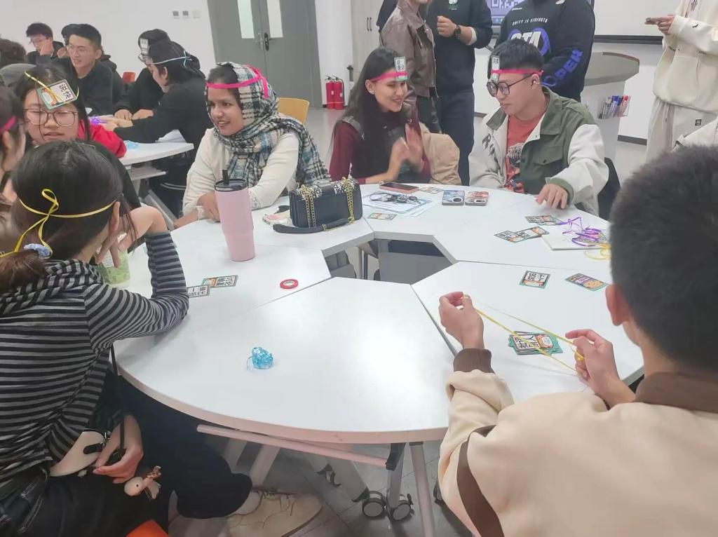 主题游戏“Don’t do That”将现场氛围推向高潮。同学们围坐在一起,佩戴带有关键词的头带,在紧张而欢乐的对话中展开头脑风暴,既要敏锐捕捉对方的“陷阱”,又要巧妙布设自己的“迷局”。言语攻防精彩纷呈,现场的掌声与欢笑不断,这场游戏既是对语言熟练度和临场反应能力的考验,更是对促进跨文化交流的生动实践。
