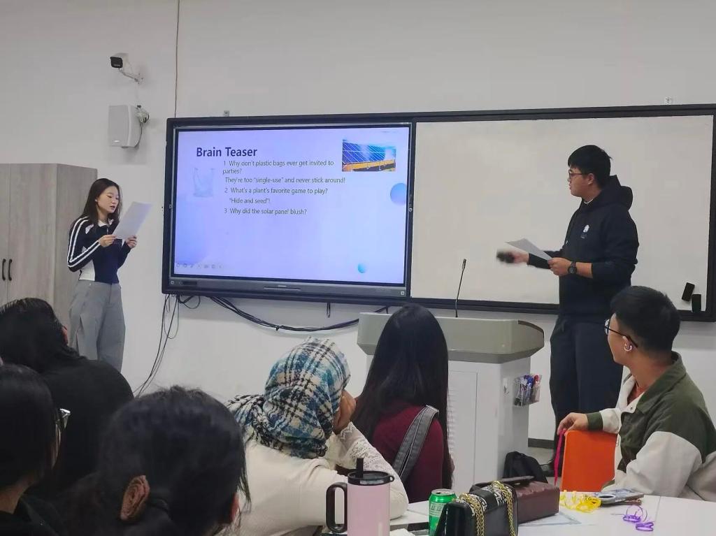 活动伊始,第一环节的有关环保主题的“Brain Teaser”引燃全场热情。巧妙的问题设计引发阵阵思辨,同学们踊跃参与,积极抢答,现场变为了环保知识竞技场。这场趣味挑战不仅是一次语言实践,更将环保理念潜移默化地植入每位参与者的心中。